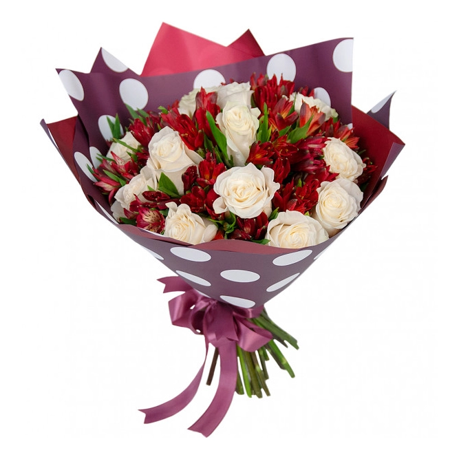 Контрастный букет сочетает нежные белые розы и яркие красные альстромерии. Идеальный подарок для выражения искренних чувств. Букет с доставкой на дом в Бугульме.