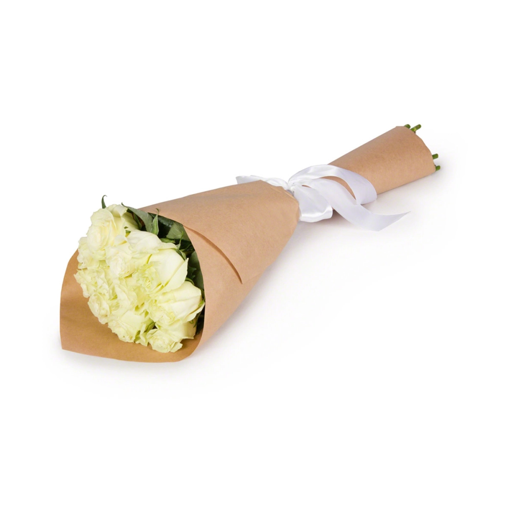 Изысканный букет из 7 белоснежных роз в стильной крафтовой упаковке — воплощение чистоты и совершенства.