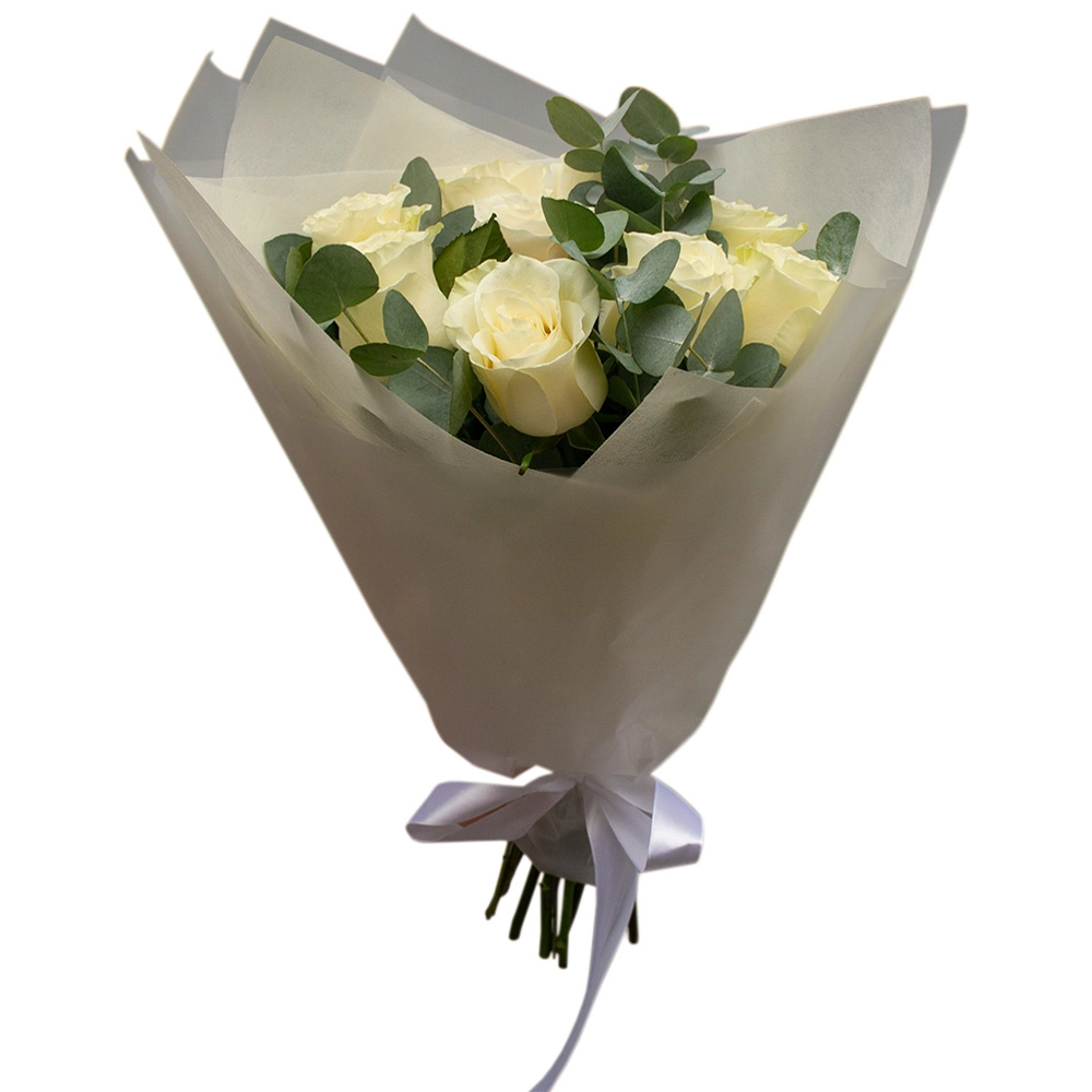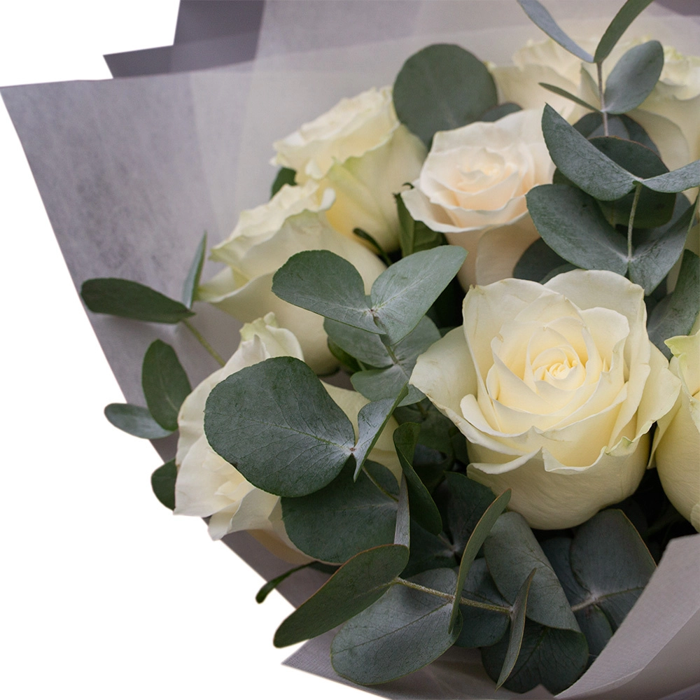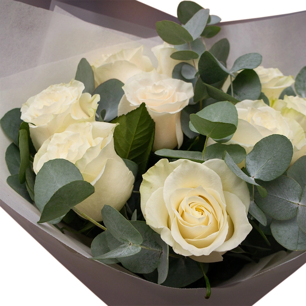 Изысканная композиция из 9 белоснежных роз в обрамлении свежего эвкалипта.