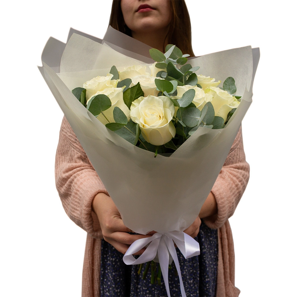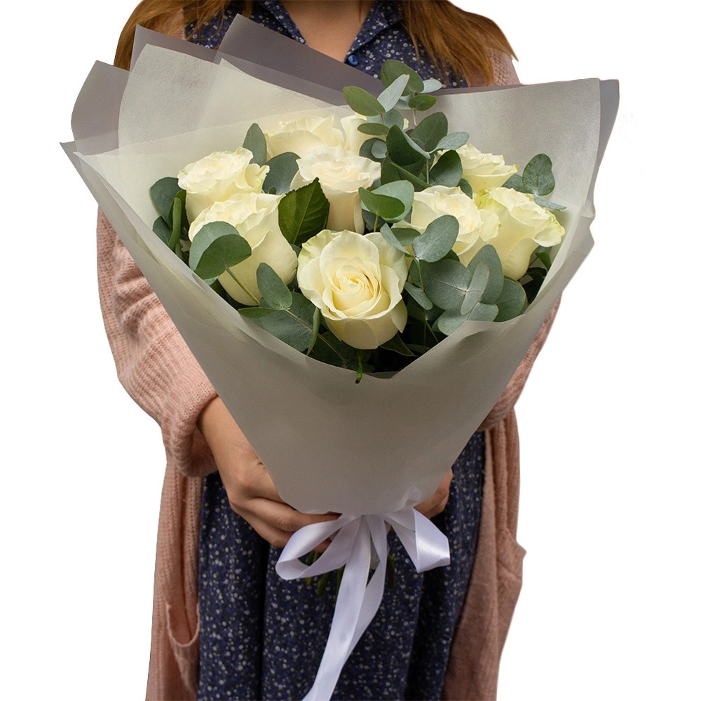 Элегантный букет из 9 белых роз с эвкалиптом – воплощение совершенства