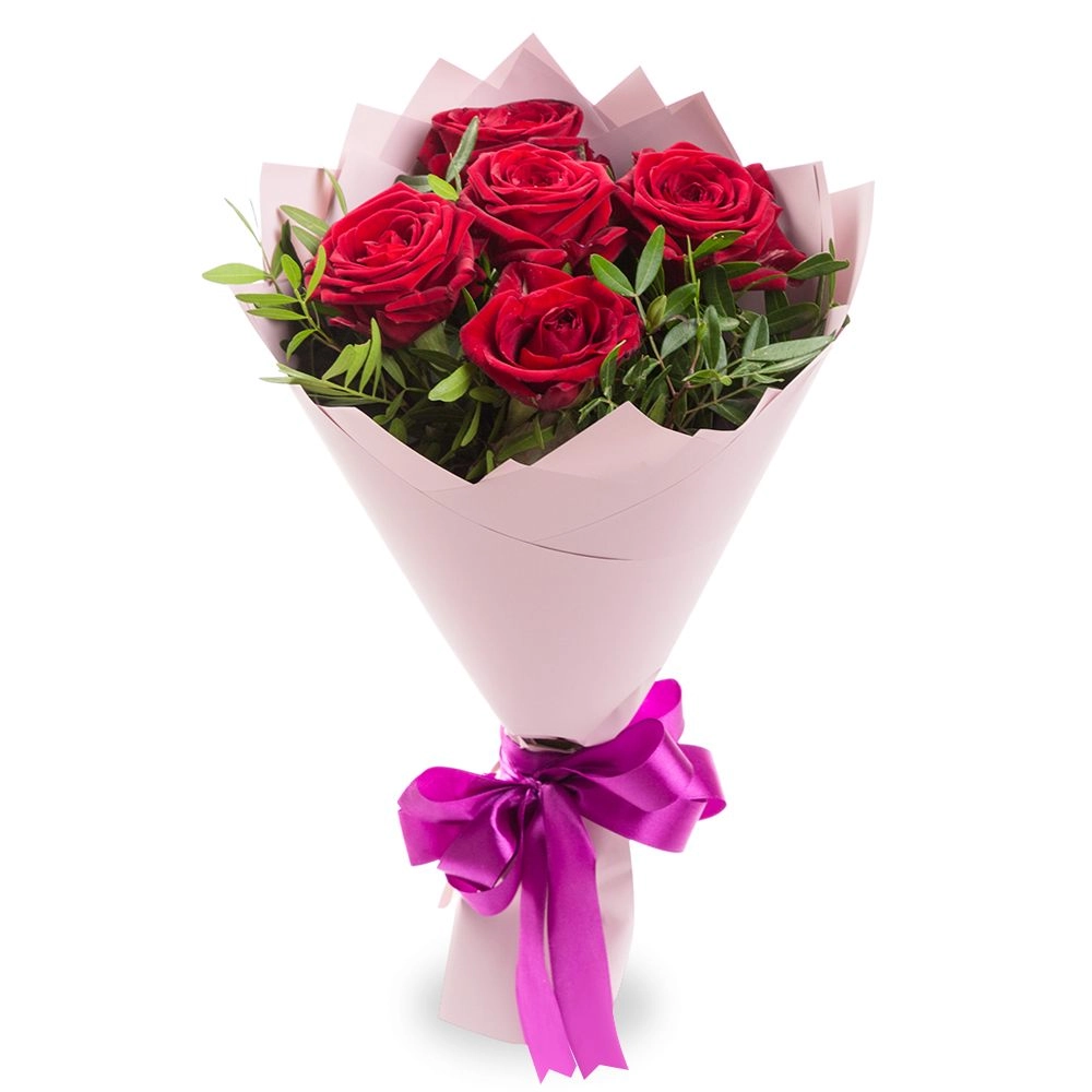 Изысканный букет из 5 красных роз с нежной фисташковой зеленью — идеальное сочетание страсти и свежести. Компактный, но выразительный подарок для особых моментов. Свежие цветы с доставкой в Бугульме.