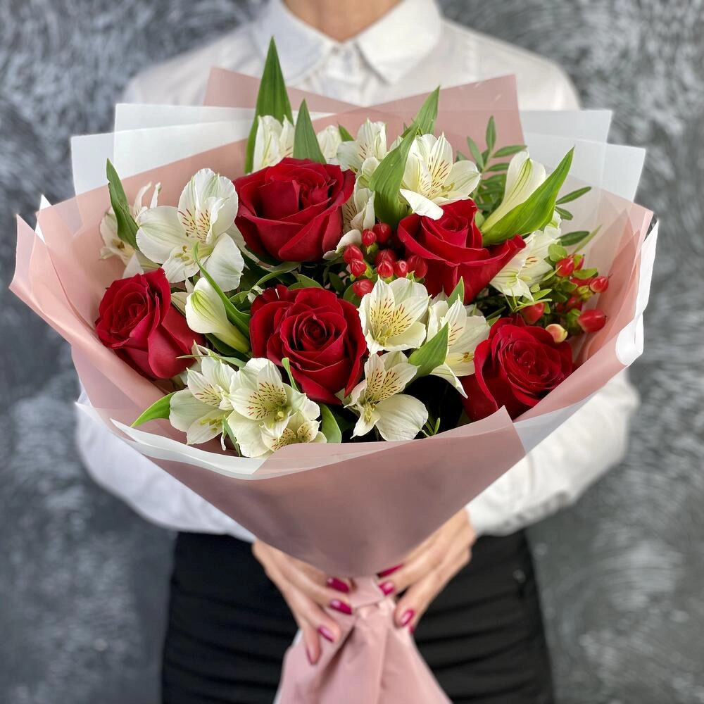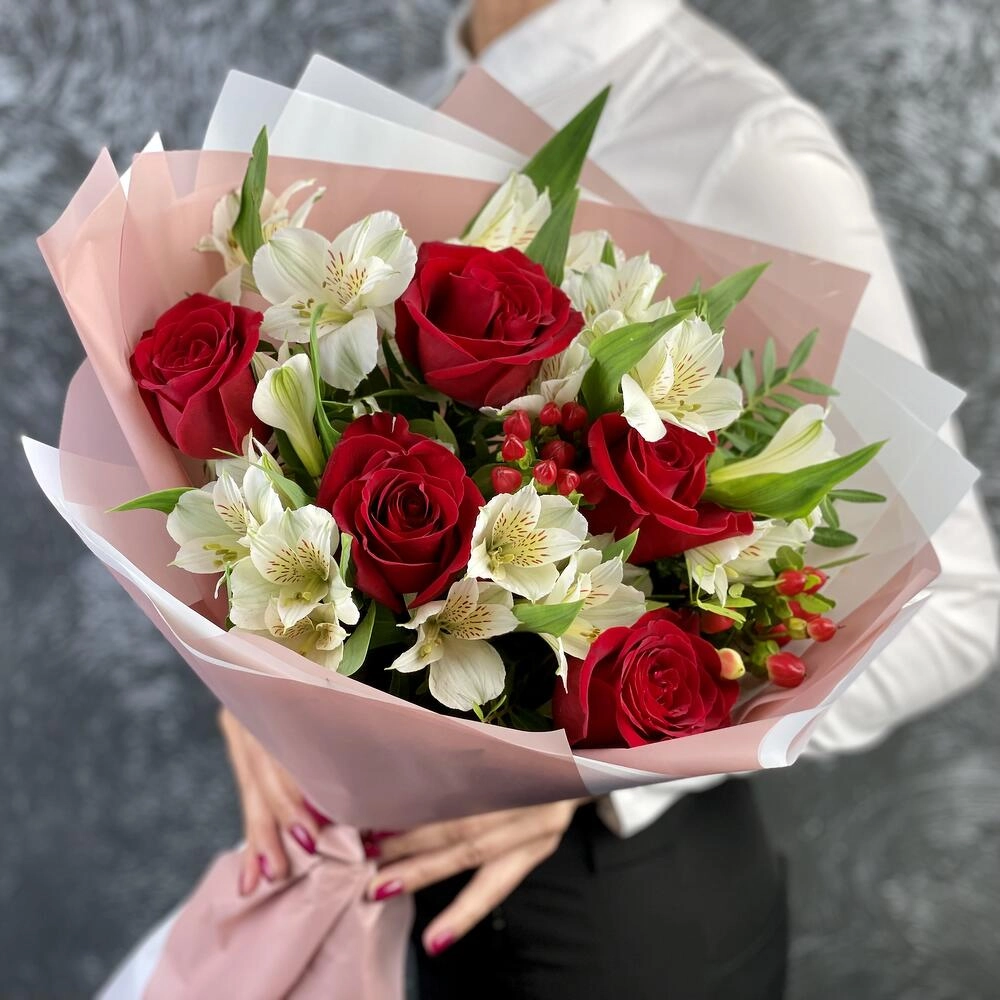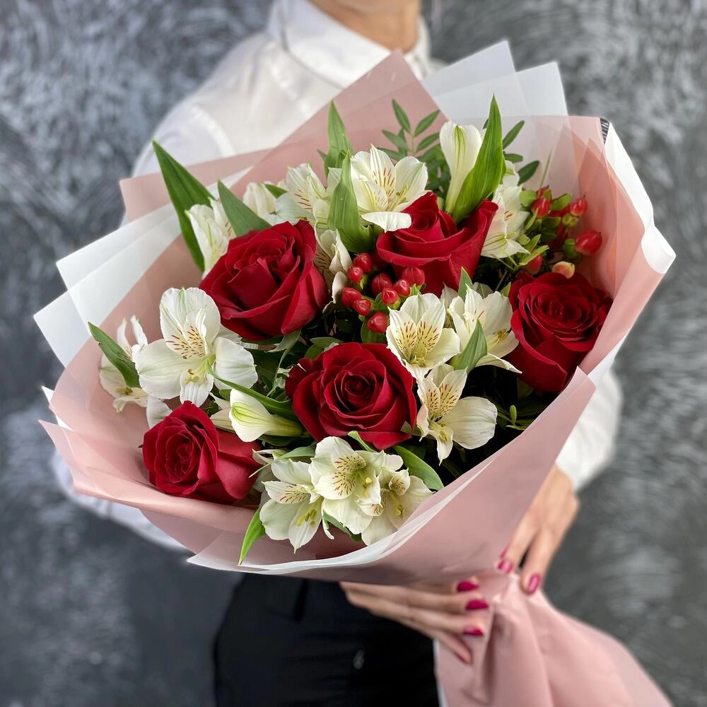 Элегантная композиция из 5 красных эквадорских роз и 4 белых альстромерий с добавлением фисташковой зелени и гиперикума. Изысканный подарок для особых моментов. Заказ цветов с доставкой на дом Бугульма.