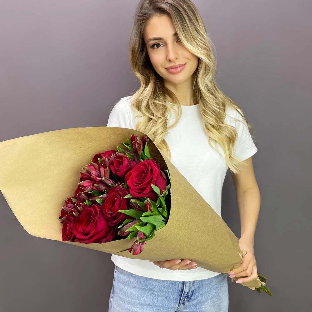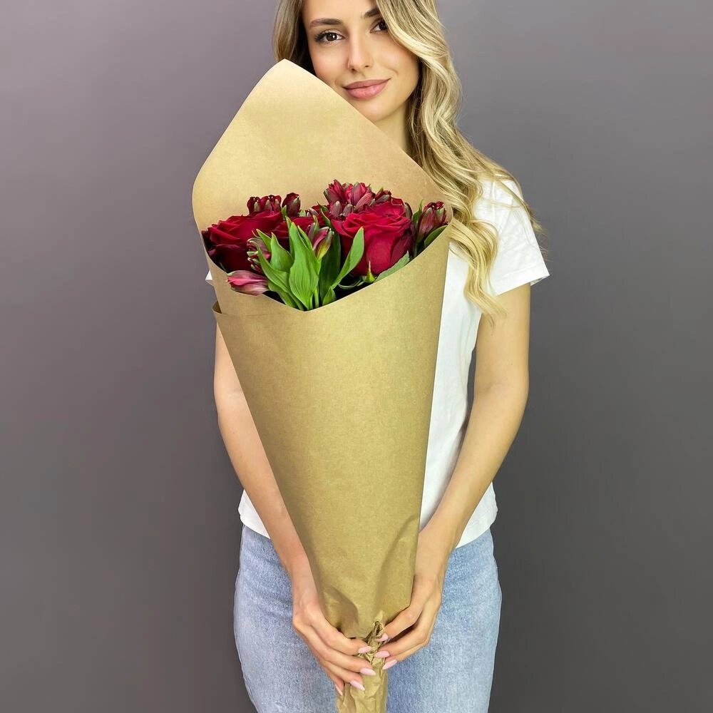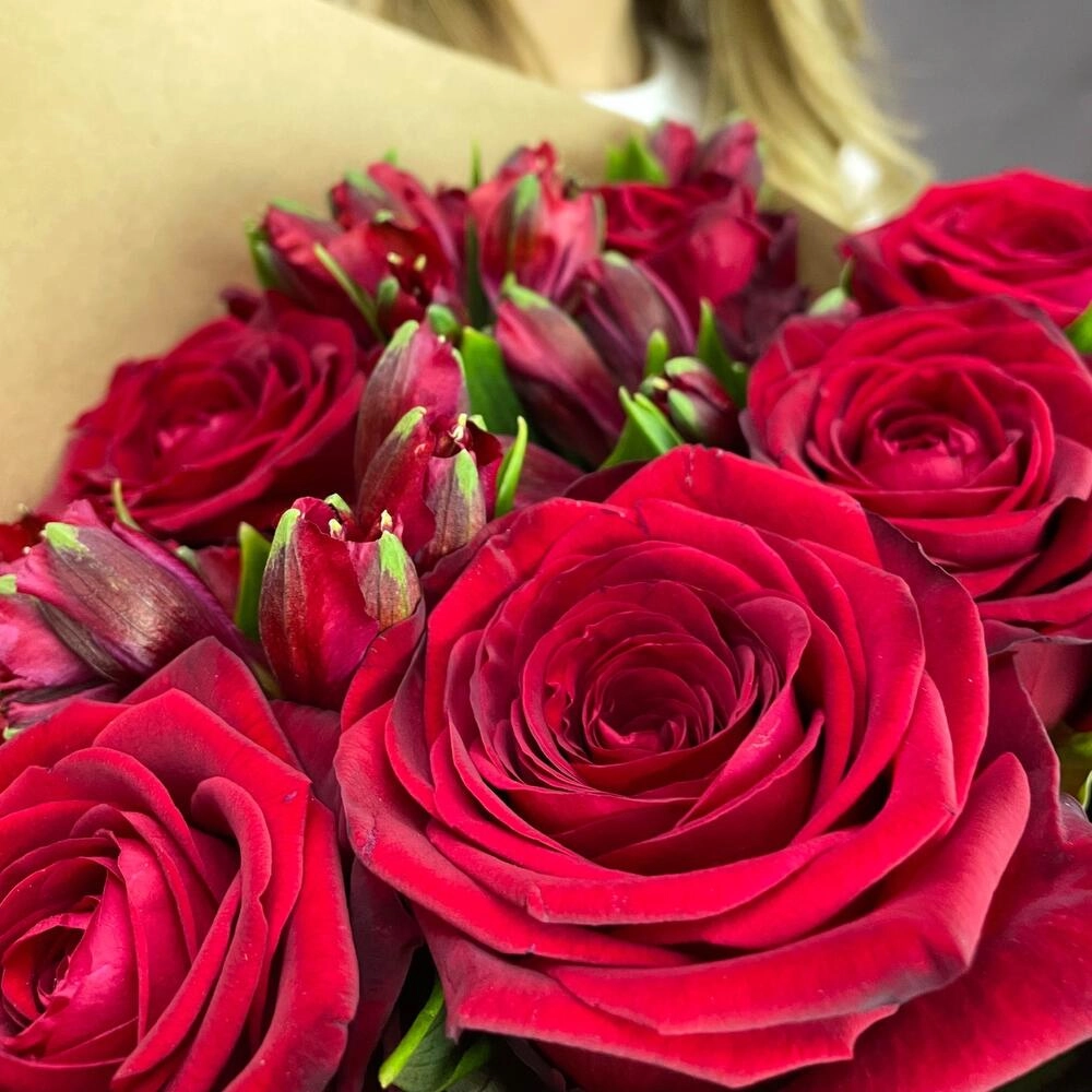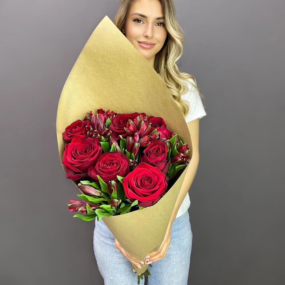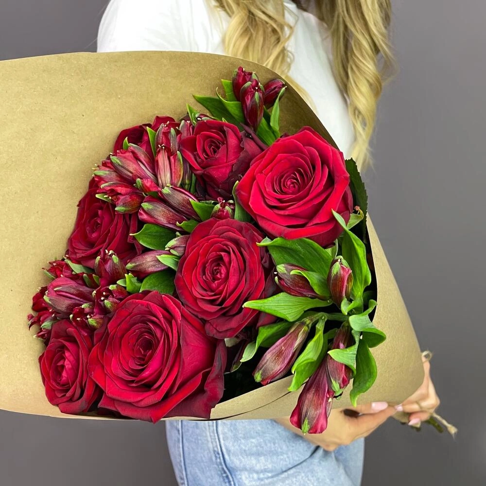 Эмоциональный букет «Страсть» сочетает пышные красные розы и изящные альстромерии, создавая идеальный баланс между страстью и нежностью.