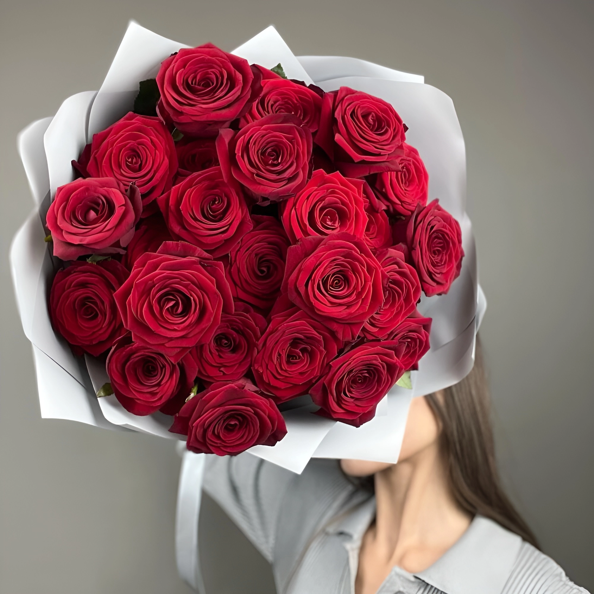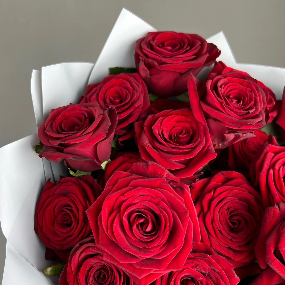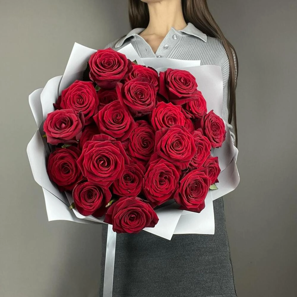 Изысканный букет из 25 роз красного оттенка с длиной стебля 60 см — воплощение королевской роскоши. Упакован в матовую плёнку с атласной лентой. Идеальный подарок для особых моментов. Купить букет роз Бугульма.