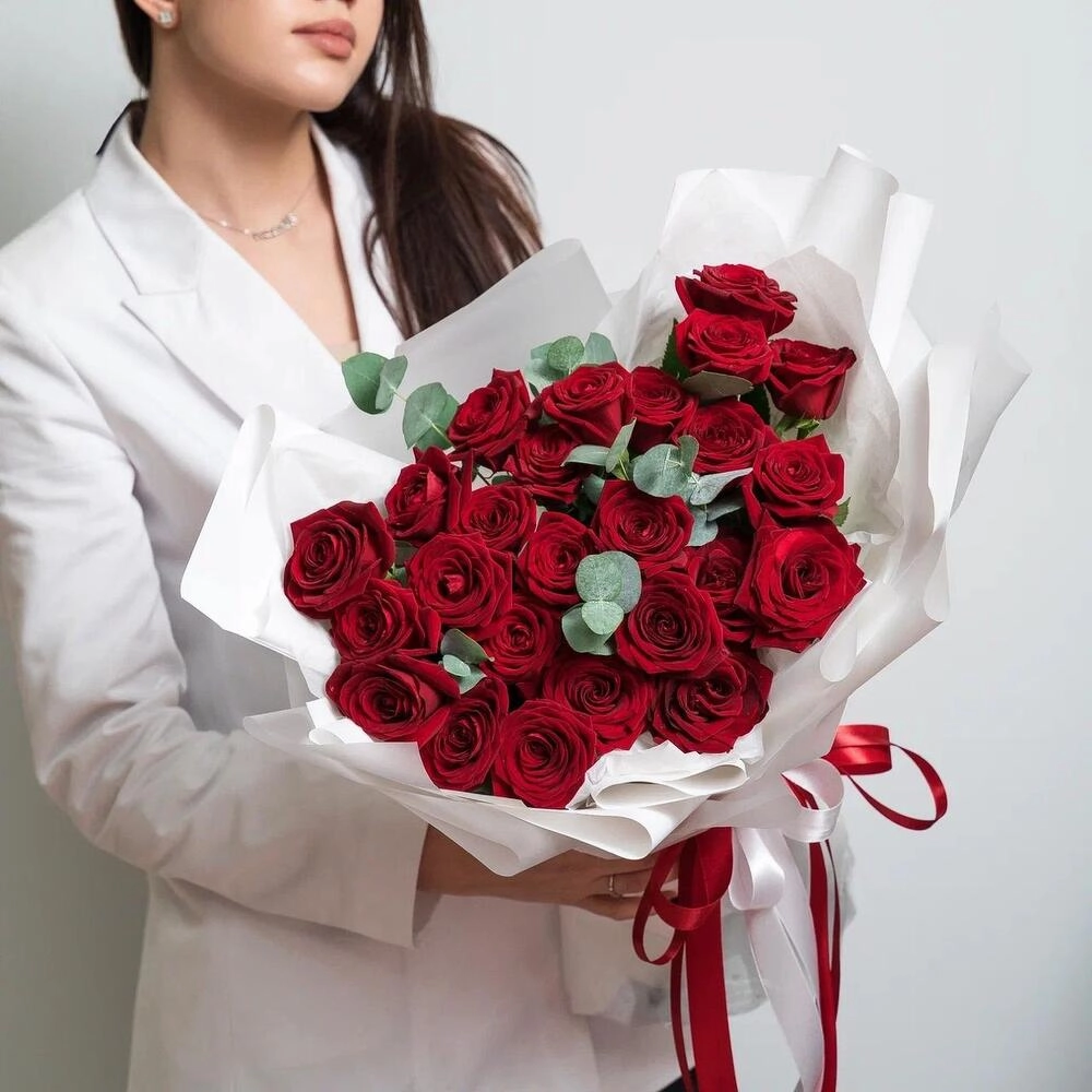 Элегантная композиция из 25 свежих красных роз с серебристыми веточками эвкалипта — воплощение страсти и изысканности.