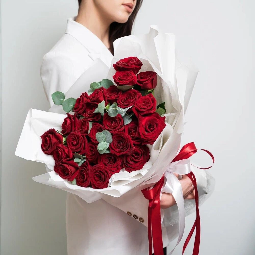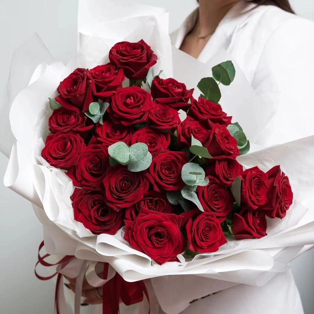 Роскошный букет из 25 красных роз с эвкалиптом – королевский подарок