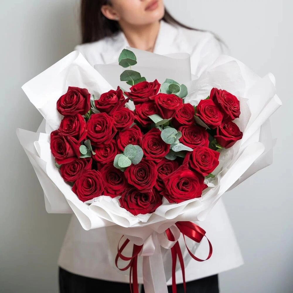 Элегантная композиция из 25 свежих красных роз с серебристыми веточками эвкалипта — воплощение страсти и изысканности. Идеальный выбор для особых моментов и важных признаний. Купить букет роз в Бугульме.