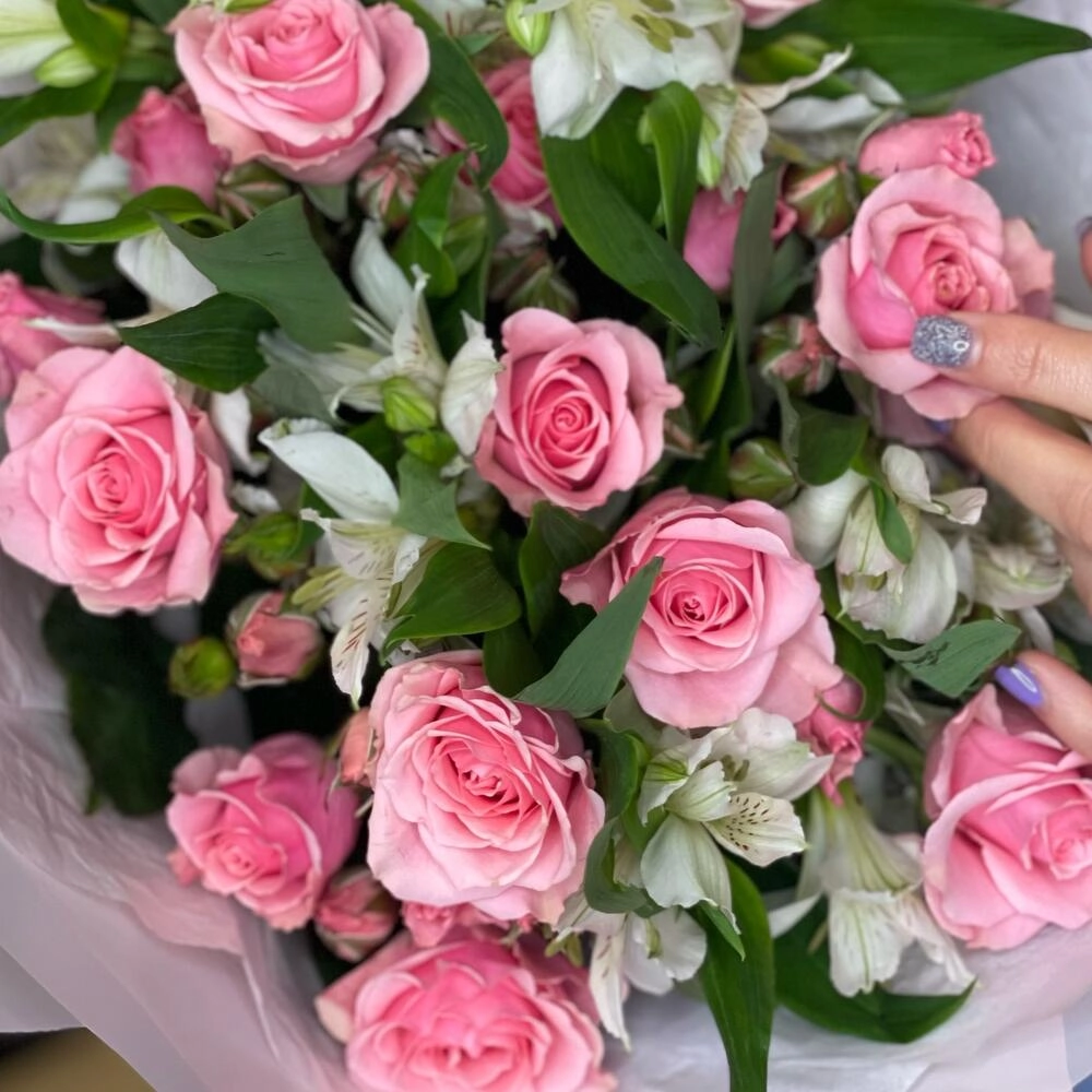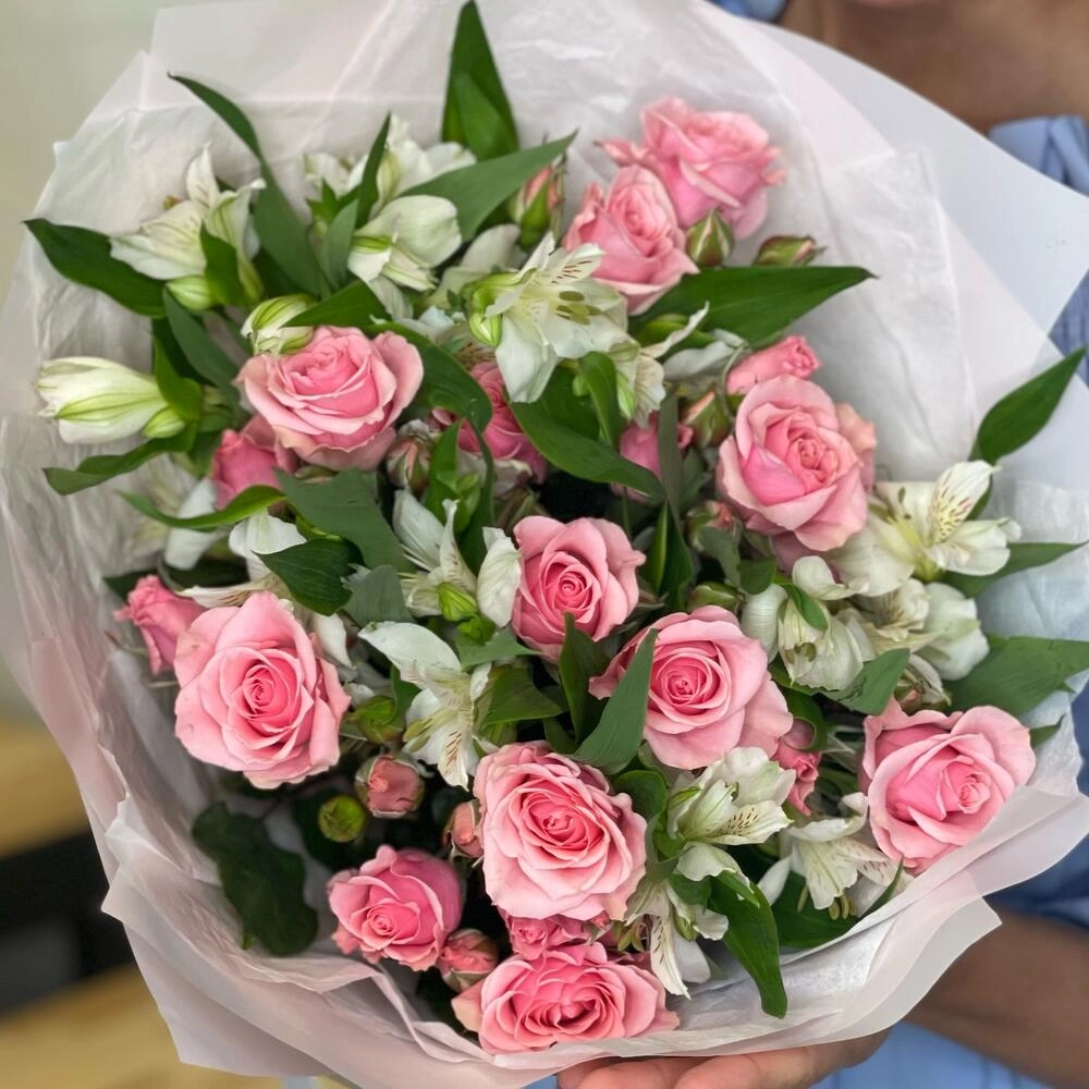 Букет «Розовый фламинго» – нежность розовых кустовых роз и белых альстромерий