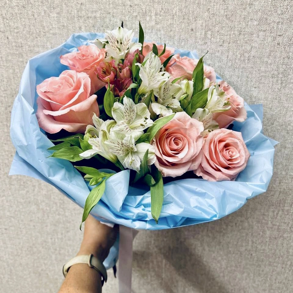 Свежий букет «Фреш» сочетает розовые розы и белоснежные альстромерии в гармоничной композиции.