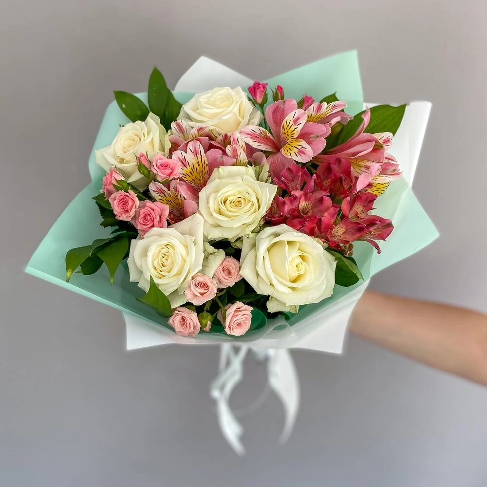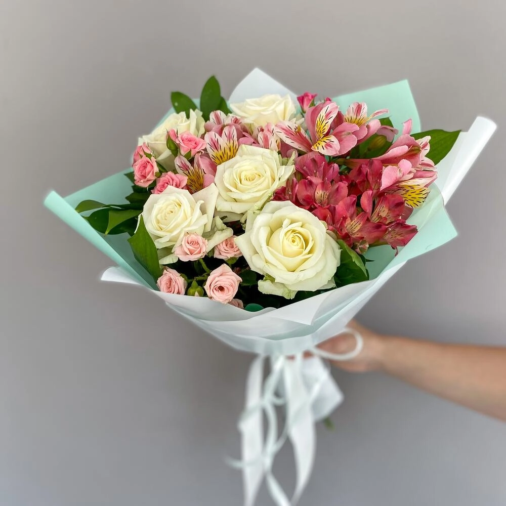 Утончённая композиция из классических роз, пышных кустовых роз и нежных альстромерий создаёт атмосферу элегантности. Идеальный выбор для особых моментов. Заказать букет цветов с доставкой на дом.