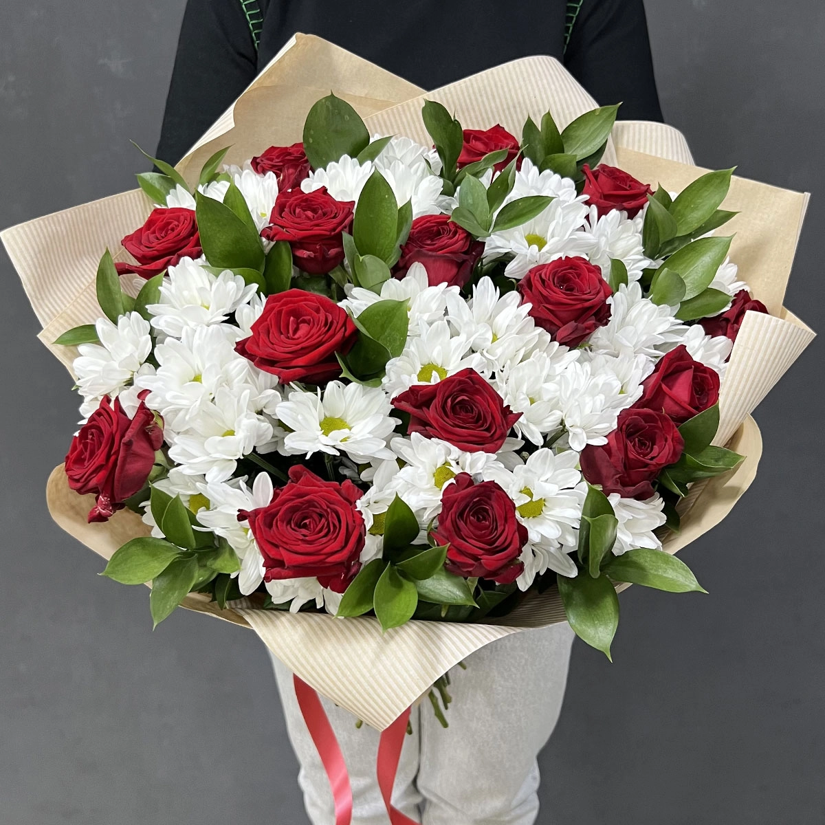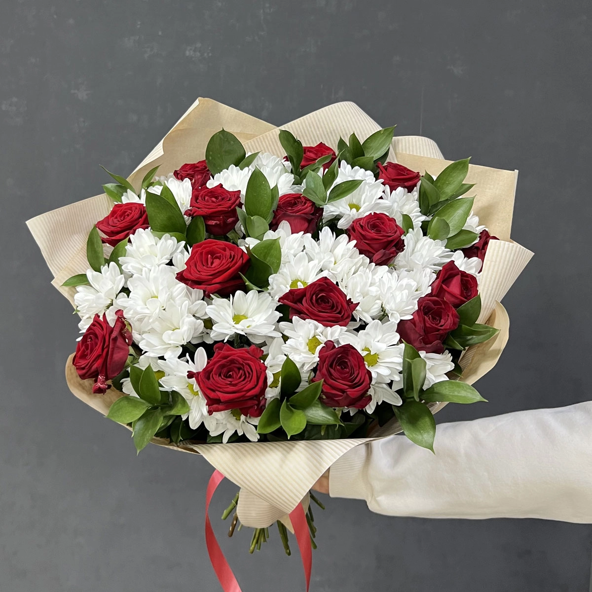 Нежная композиция из красных роз и белых хризантем создаёт атмосферу искренних чувств. Идеальный выбор для романтического подарка. Доставка свежих цветов в Бугульме.