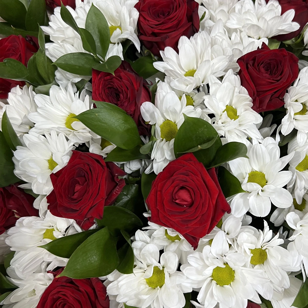 Нежная композиция из красных роз и белых хризантем создаёт атмосферу искренних чувств.
